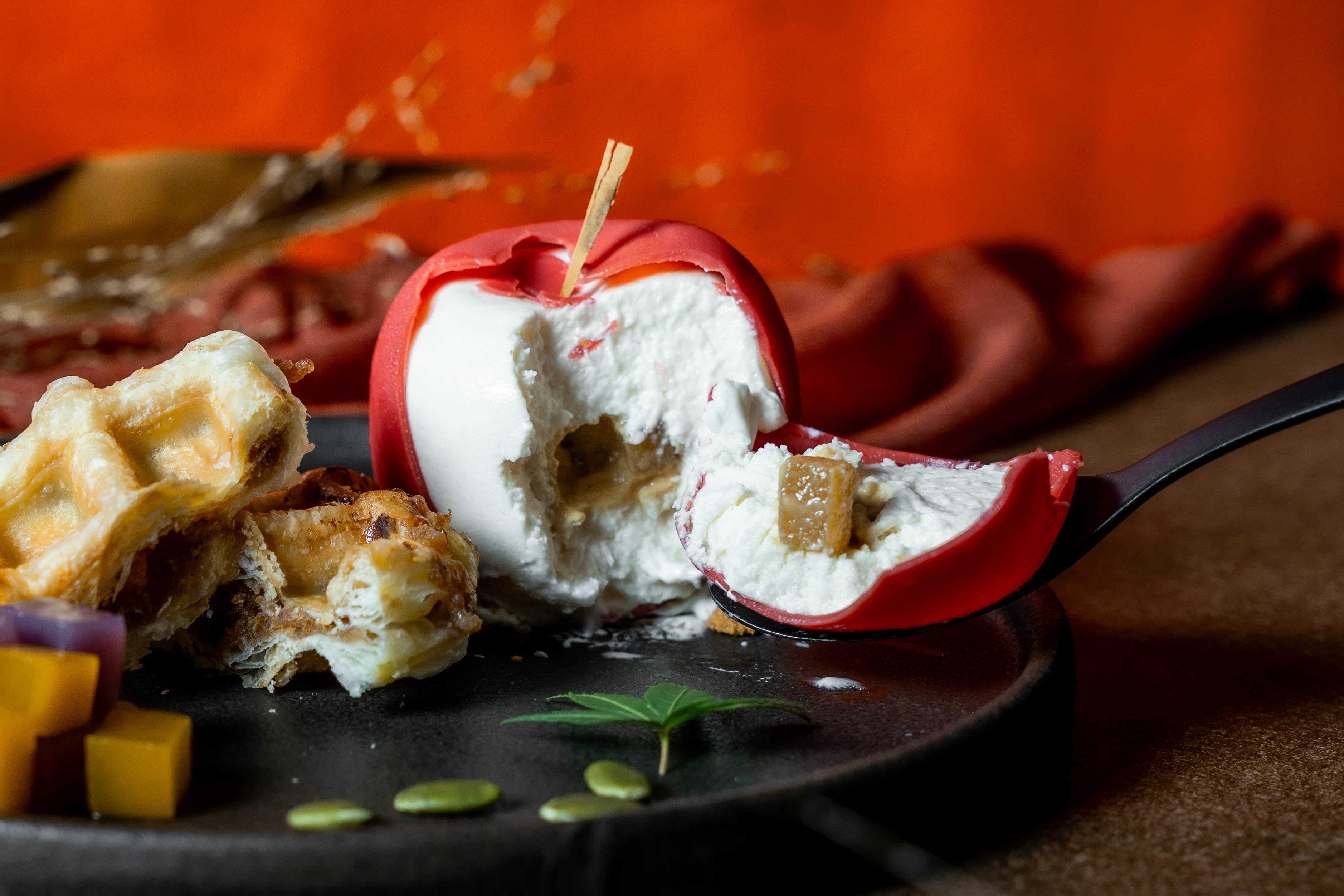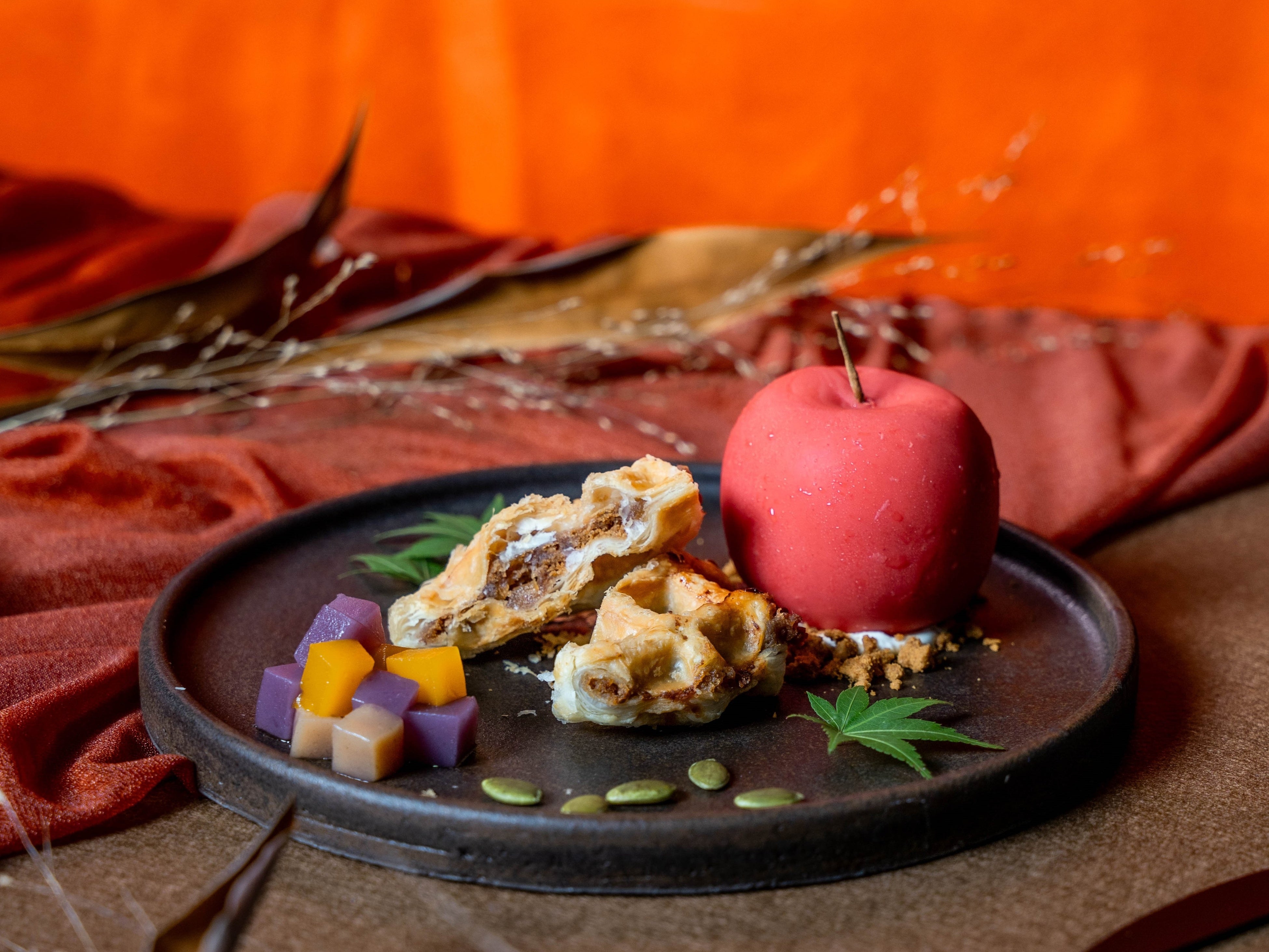 思わず視線を奪われるぷっくりとした赤いりんごは一見すると実物のりんごのように見えますが、その正体はフランスの伝統菓子「タルトタタン」からインスピレーションを受けたムースケーキです。ナイフを入れると濃厚なキャラメルソースかとろりと流れ出し、りんごの風味がしっかりと感じられるコンポートムースと一緒に食べると、タルトタタンのようなキャラメリゼされたりんごの風味豊かな味わいが広がります。さらに、じっくり煮込んだりんごと栗の餡を包みんだワッフルと一緒に味わえば、タルトのような食感や風味が加わり、より伝統的なタルトタタンに近い、しかし新しい感覚のスイーツを体験することができます。添えらえれたキューブ状の羊羹は、紫芋やカボチャを使用しており、柔らかな甘みと深みのある味わいで和の風味もお楽しみいただけます。