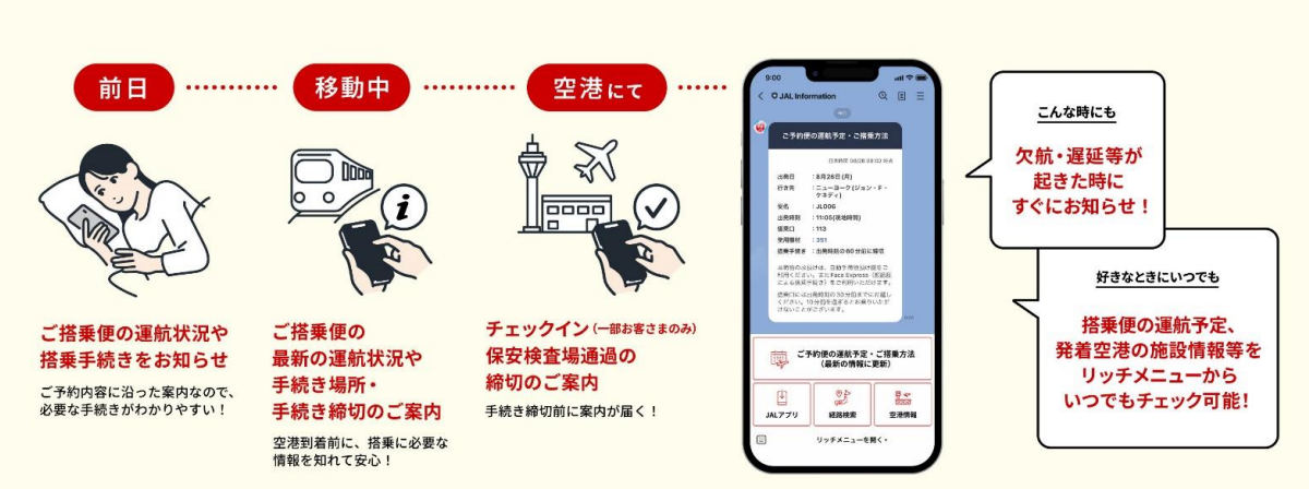 JALは、2024年9月18日(水)より、LINEヤフー株式会社(本社:東京都千代田区、代表取締役社長:出澤 剛)が運営するLINEの法人向け機能「LINE通知メッセージ」(*1)を航空業界としては初めて活用し、国際線をご利用のお客さまに対して、個々の予約内容に基づいたご案内サービスの提供を開始します。