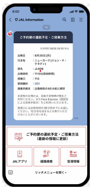 また、「LINE」のトーク画面下部に表示されるリッチメニューも刷新します。お客さまのお好きなタイミングで、ご予約便の最新の運航予定・ご搭乗方法や、出発・到着空港の施設情報などその他サービスをご利用いただくことも可能になります。