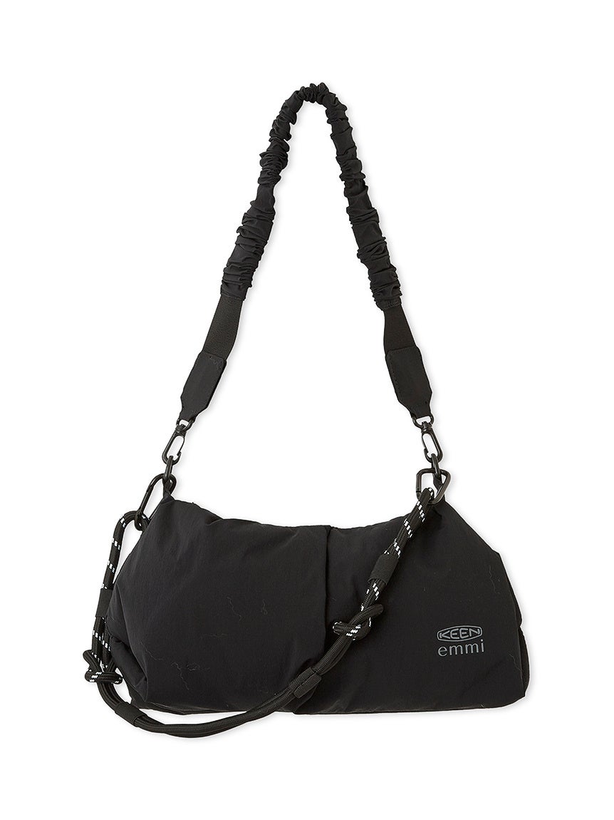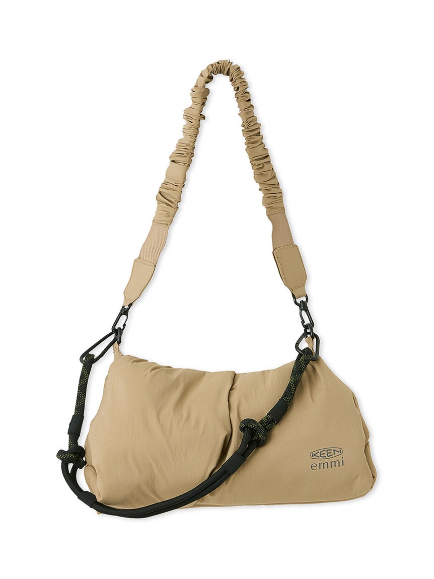 emmiで人気のショルダーバッグもKEEN仕様に。持ち手はギャザーショルダーと、アウトドア感あるコードの2本をカラビナで取り外しできる仕様。