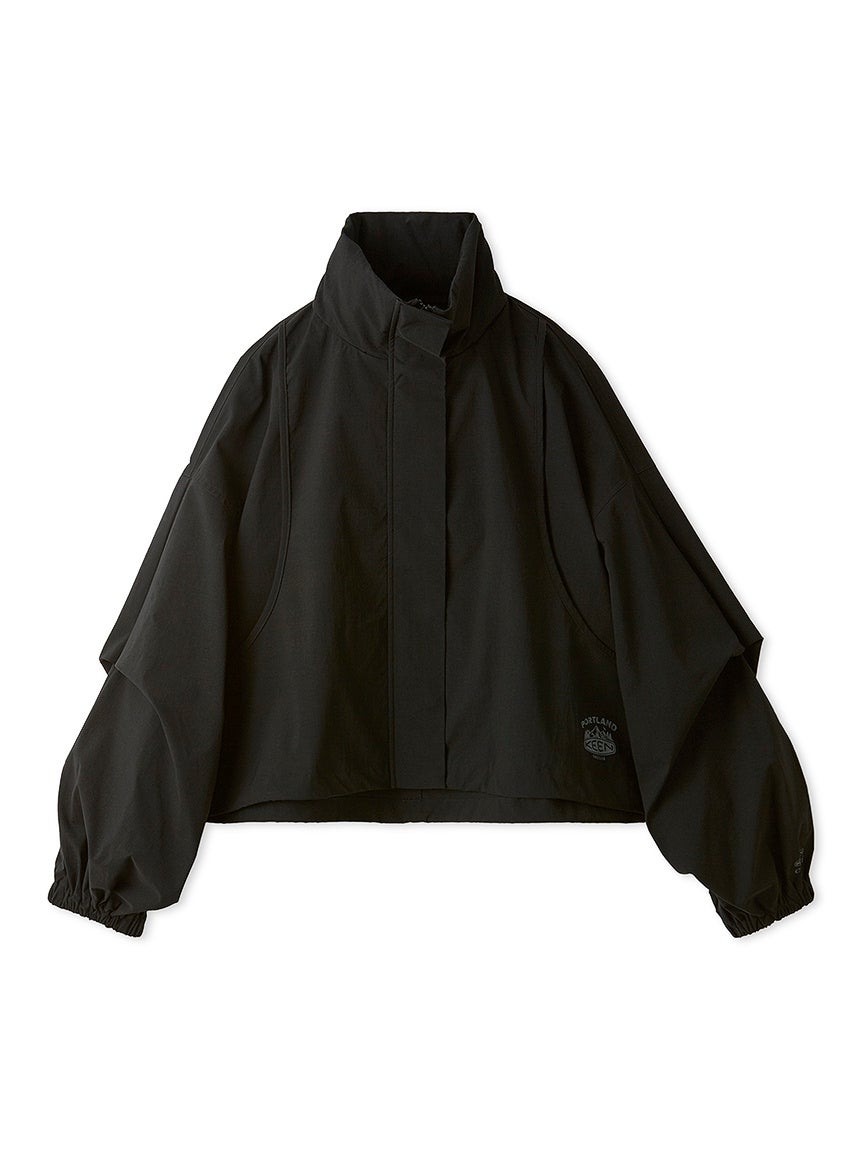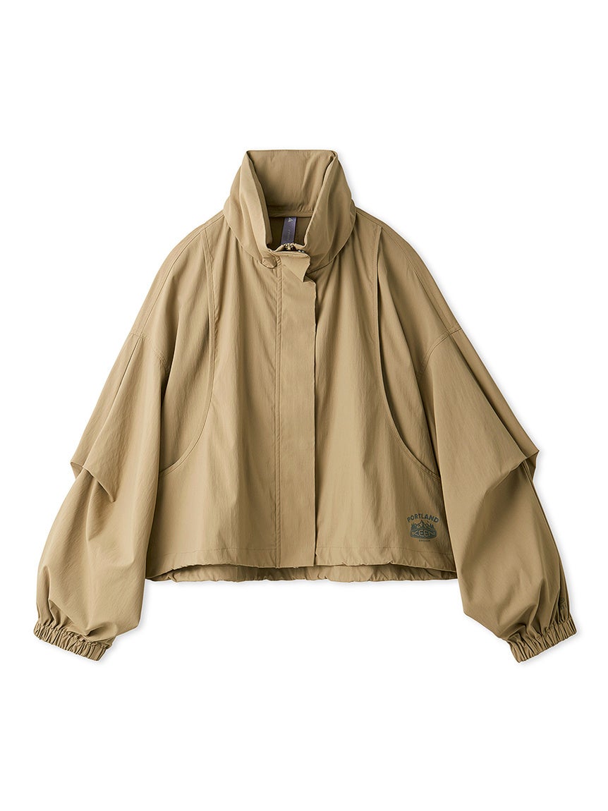 裾のドロストでシルエットの変更が可能で、コードエンドにはKEENのシューズと同じプラパーツを使用しています。フロントのポケットと収納できるフードなど、機能性にも優れています。