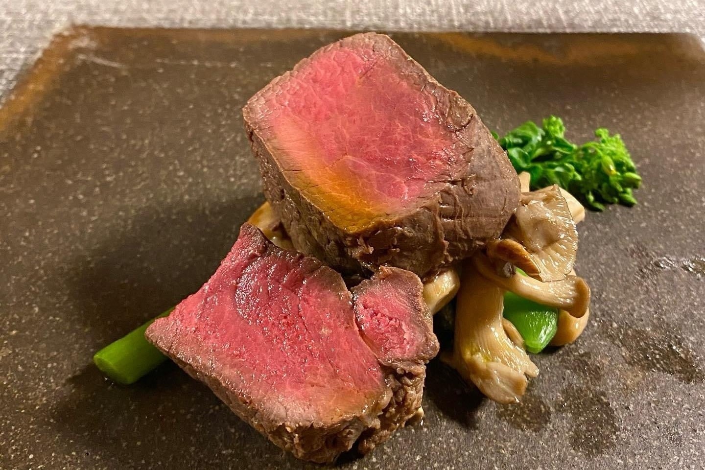 やたきやでは、創作イタリアンの技法を基にした独自のジビエ料理が提供されています。今回のディナーでは「熟成肉つむぐ」の長期ドライエイジングによる熟成シカ肉を使用し、より一層プレミアム感を引き立てています。熟成肉つむぐの肉は、ミシュラン三つ星シェフにも愛される、じっくりと熟成されたナッツのような香りと深い旨味が特徴。地元の新鮮な食材と鹿肉を絶妙に組み合わせ、ジビエ初心者でも食べやすく、上品ながらも深い風味を存分に楽しめるメニューとなっています。