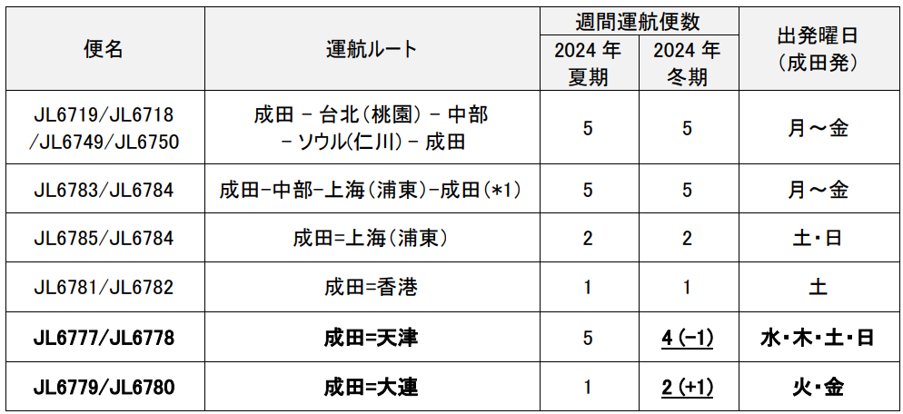 お客さま需要に合わせた利便性向上のため、成田=天津線を週4便、成田=大連線を週2便に変更して運航します。