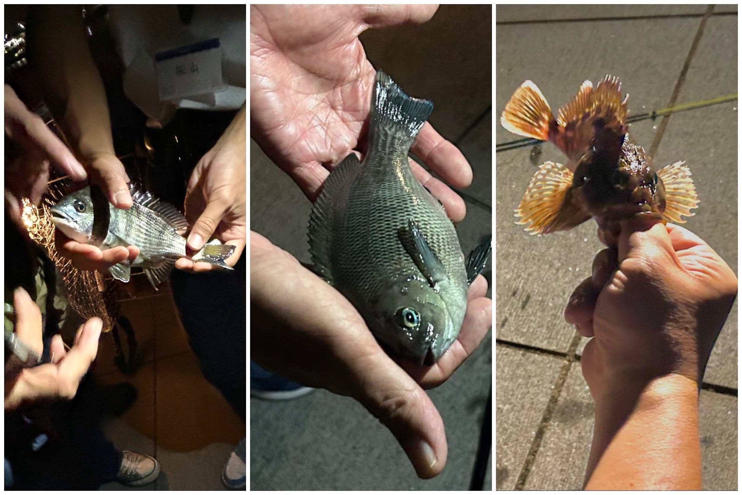 この後受講生は外へ出てヘチ釣りに挑戦しました。みんなでワイワイしながらの釣りだったのでお魚がたくさん釣れる雰囲気では無かったのですが、なんと小さめのクロダイが2尾、メジナが1尾、カサゴ1尾が釣れました!それもほんの20分くらいで!