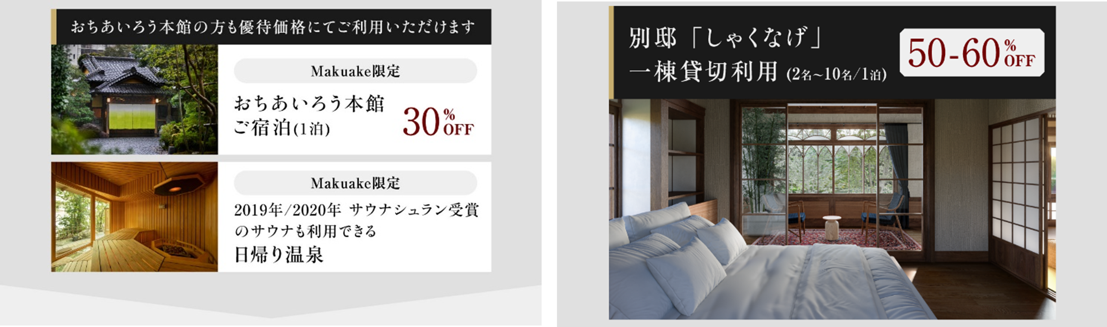 この度のオープンを記念し、アタラシイものや体験の応援購入サービス”Makuake(マクアケ)”サイトにて、一棟貸し別邸「しゃくなげ」を50~60%OFFでご利用いただける、先行予約受け付けを9月29日(日)10:00より開始いたします。