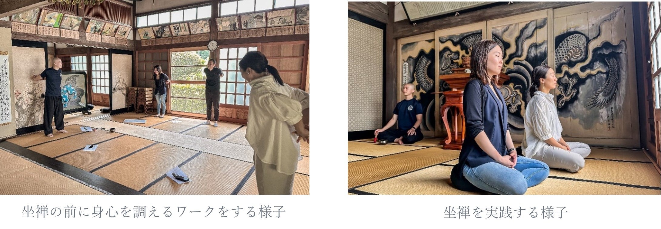 まずは、全体の流れについて説明後、簡単にできる身心を調(ととの)えるワークを行い、約15分間の坐禅を実践します。足を組むことがむずかしい場合は、胡坐や座椅子をご利用いただけます。坐禅は、痛みを我慢する苦行ではなく、「帰家穏坐(きかおんざ)」とも呼ばれ、自らの「からだとこころ」という落ち着きどころに帰り、穏やかに坐(すわ)る実践です。ワークを通じて身体を調えることで、自然と息も心も静まり、より深い坐禅体験を味わっていただけます。