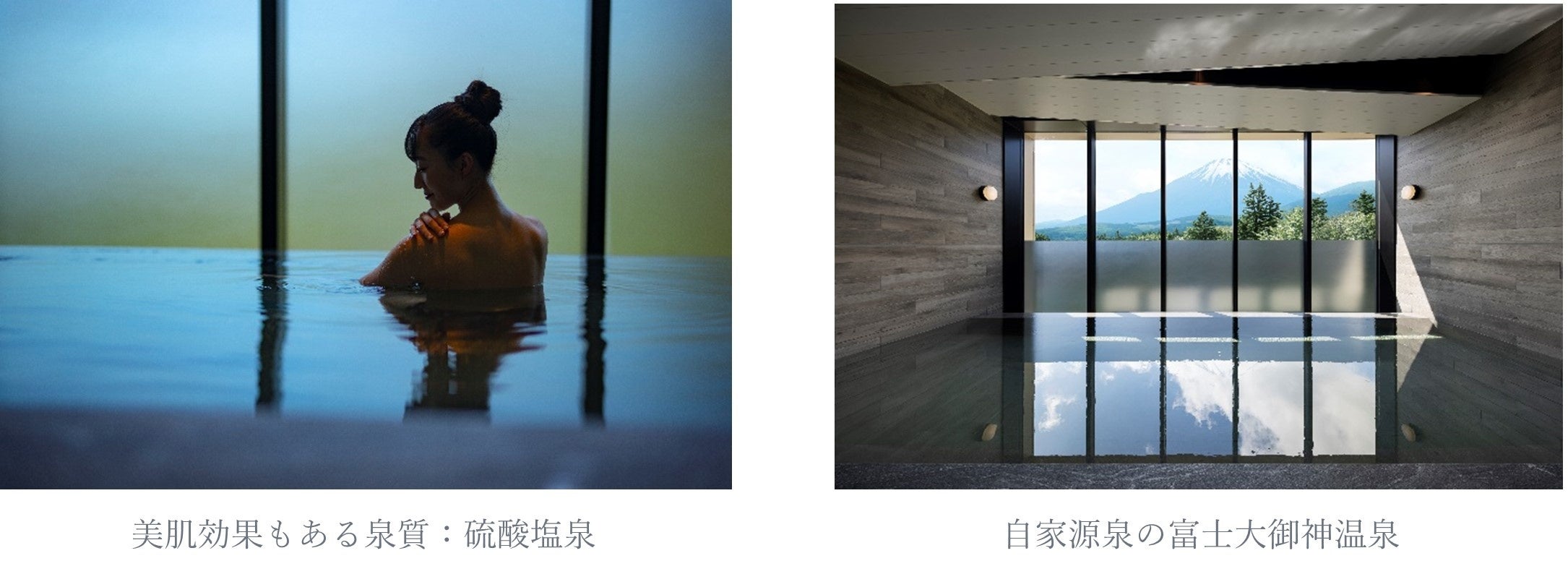 スパトリートメントの後は、同じ建物内にある富士大御神温泉にお立ち寄りください。半露天風呂を備えた大浴場では、ホテルの地下1,500mから汲み上げた自家源泉の硫酸塩泉を、富士山の絶景とともにお楽しみいただけます。この泉質は、美肌効果が期待されるとともに、体の芯から温まり、霊峰富士のエネルギーに包まれた特別なリトリートをご堪能いただけます。