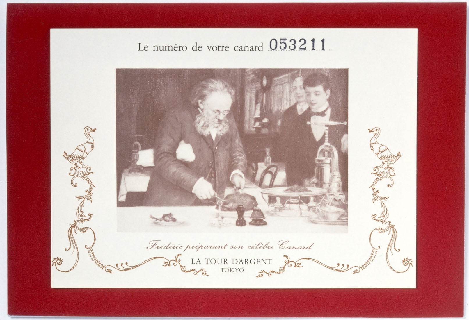 トゥールダルジャンのシグネチャーメニューといえば「鴨料理」。19世紀から続くこの伝統を作り出したのは、当時のトゥールダルジャンのオーナーであり、現在もスペシャリテとして伝承されている『幼鴨のロースト』の生みの親、フレデリック・ドゥレールです。後世にもこの鴨料理が継承されることを確信していた彼は、1890年幼鴨一羽ずつに通し番号をつけ、その番号を記した記念のカードを料理とともにゲストに渡すことを思いつきました。それは鴨をカットするフレデリックの写真入り絵はがきになっていて、当時料理に感動したゲストがその場で友人たちにメッセージを書き、店から発送したという逸話もあるほど。郵便も写真も草創期だった当初、このカードは大流行し、店の名声をさらに高めることに貢献しました。「トゥールダルジャン 東京」では、1921年に当時皇太子だった昭和天皇にお召し上がりいただいた53211番に敬意を表し、53212番から始まりました。