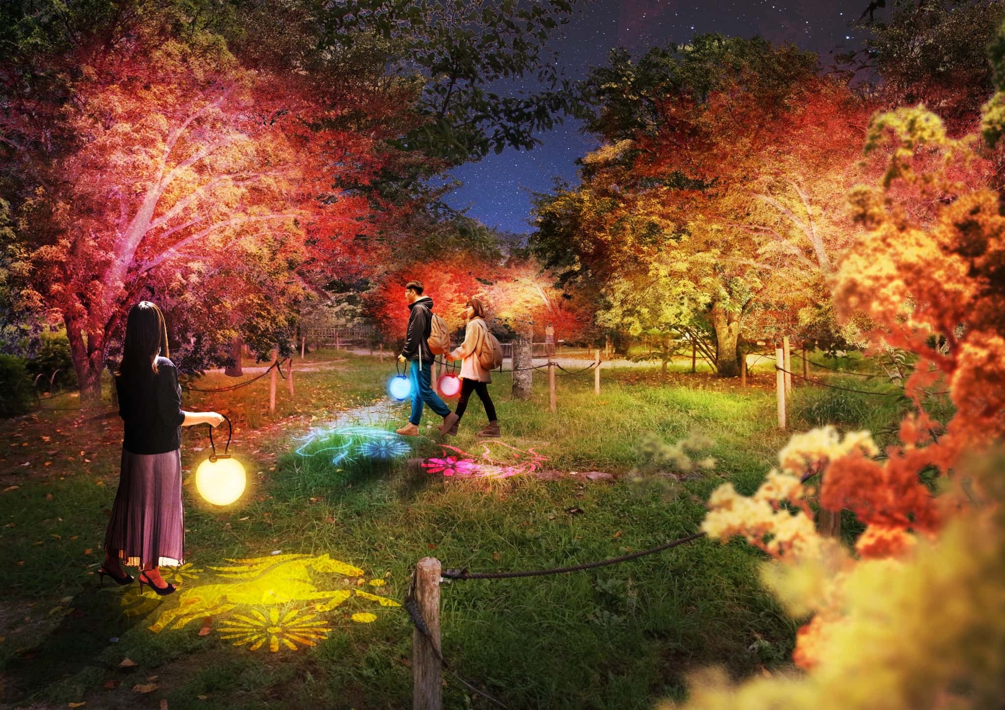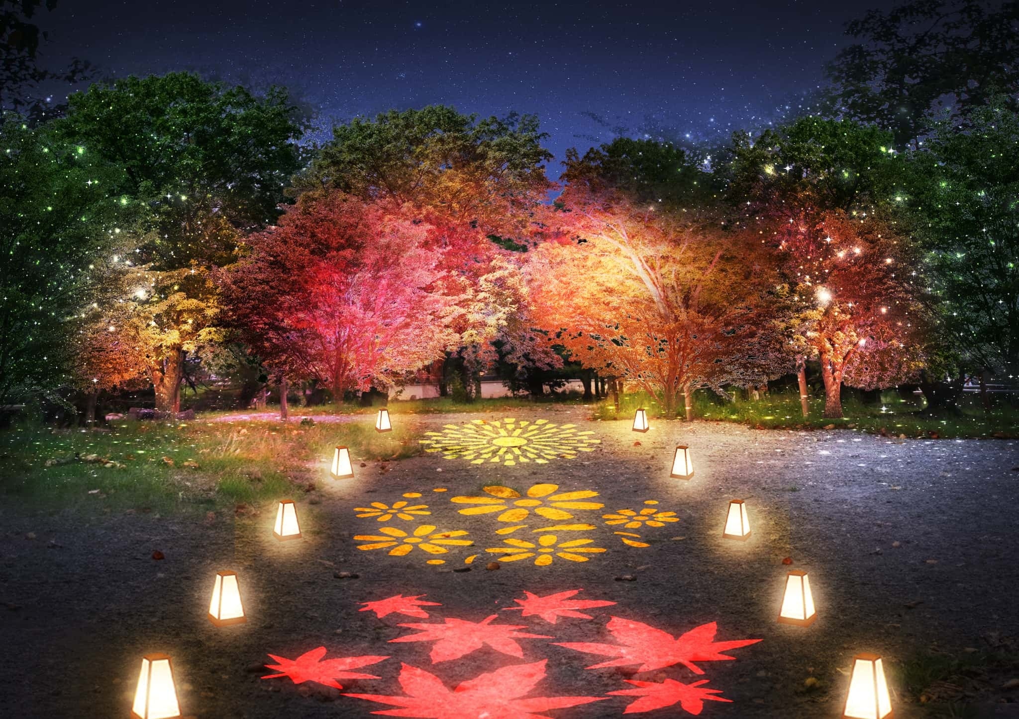 秋の草花に包まれた京都・円山公園で、光る馬が夜空を駆け抜ける
