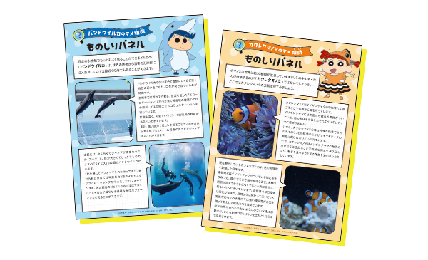 館内5箇所にオリジナル解説パネルを設置します。『クレヨンしんちゃん』の主要キャラクターたちが扮した、『うみがたり』の5種の生きものの生態について学べます。