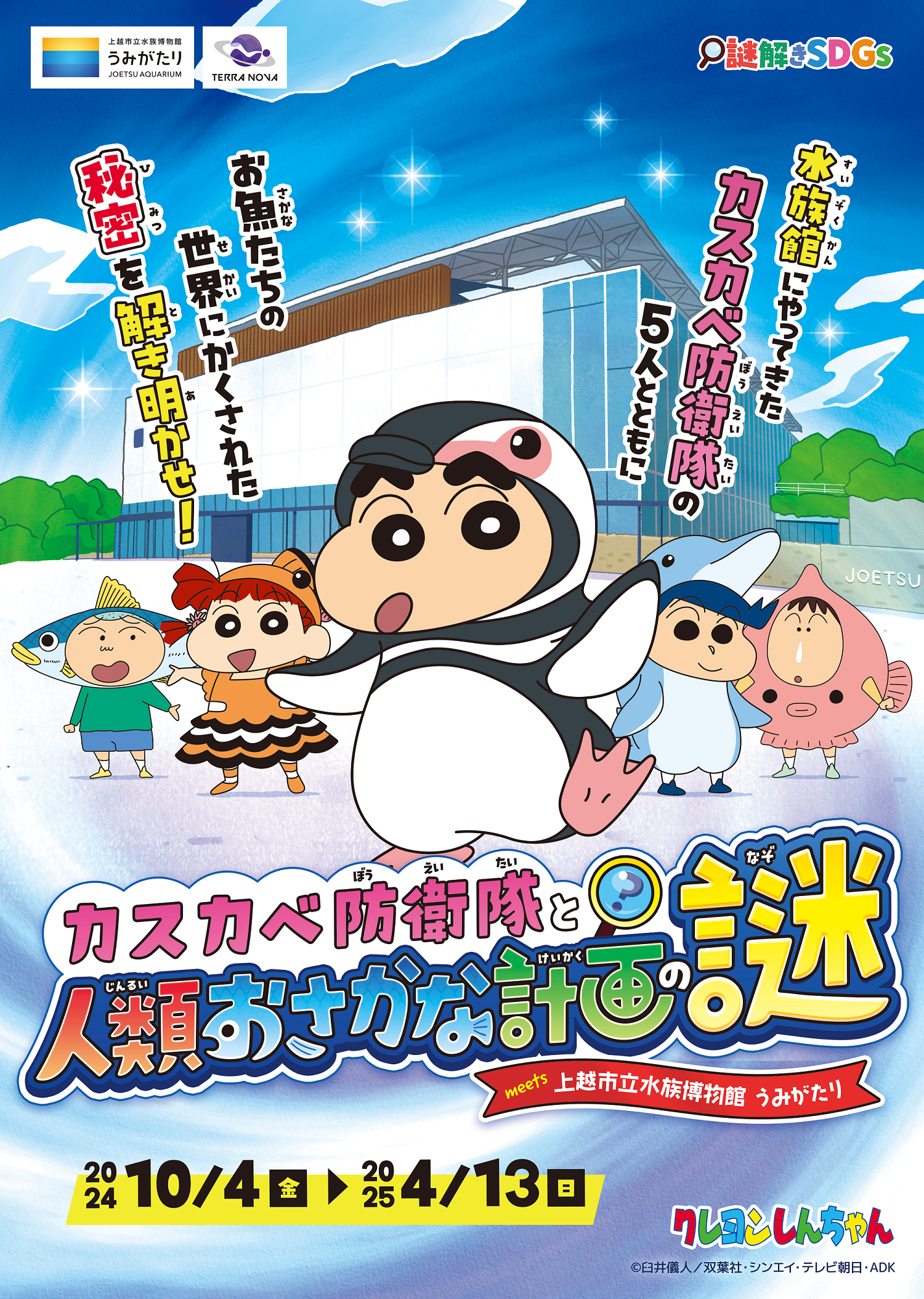 上越市立水族博物館『うみがたり』では、令和6年10月4日(金)~令和7年4月13日(日)の期間、漫画やアニメで大人気の作品である『クレヨンしんちゃん』とコラボレーションし、海の生きものをテーマにした謎解きイベント「カスカベ防衛隊と人類おさかな計画の謎meets上越市立水族博物館 うみがたり」を開催します。