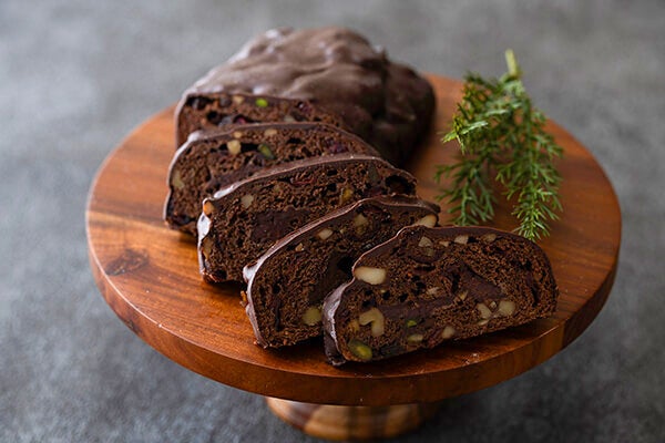 ビターなチョコ生地にフルーツとナッツを練りこみ、ヴァローナ社のチョコを包み込みました。仕上げにカカオバリー社のチョコでコーティングしたオリジナルシュトレンです。