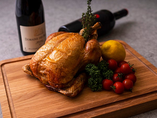 国産丸鶏にローリエ、タイム、にんにくを詰めてオーヴンでじっくりと焼上げました。オリジナルスパイスをお好みでつけてお召し上がりください。