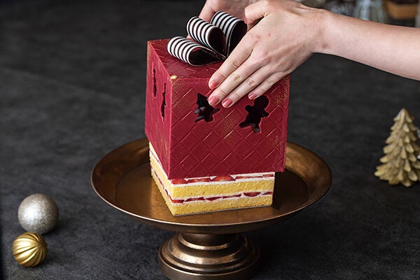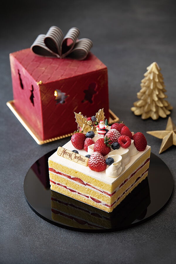濃厚なジャージークリームとジューシーなあまおうをサンドしたいちごショートケーキに、甘酸っぱいフランボワーズチョコレートのプレゼントボックスを被せました。小窓から覗くサンタクロースや柊がクリスマスを演出してくれます。パティシエ渾身のスペシャルケーキです。