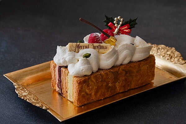 チェリーとピスタチオのムースリーヌをサクサクのパイ生地でサンドしたミルフィーユ。爽やかなチェリーのクリームにはジュレとコンポートを使用。赤と緑でクリスマスを演出し、上部にはバニラが香るホワイトチョコクリームを絞り、華やかなデコレーションで仕上げた一品です。