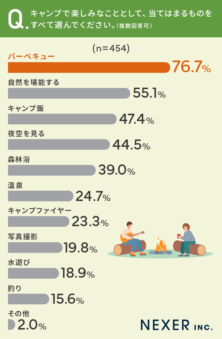 さらに「自然を堪能する」が55.1%、「キャンプ飯」が47.4%、「夜空を見る」が44.5%と続いたようです。