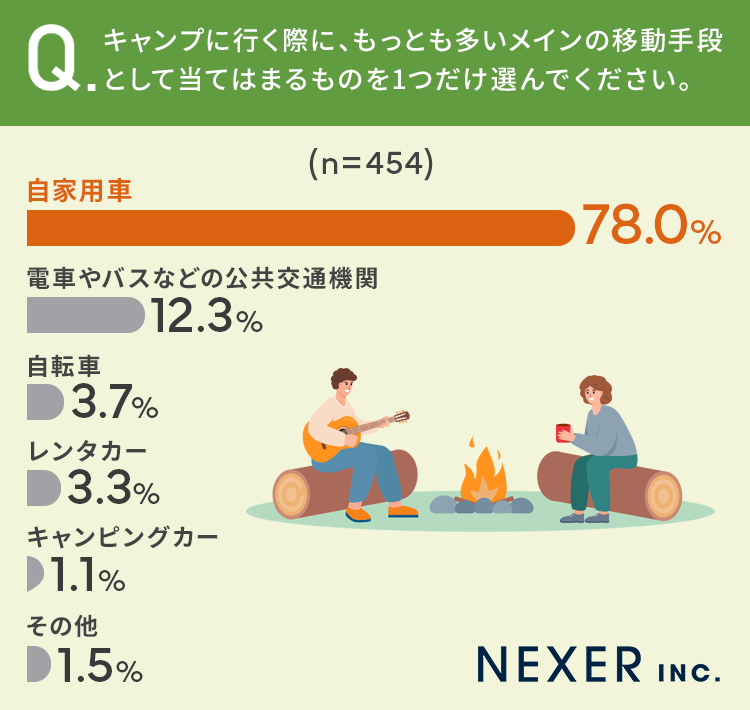 ■78%がキャンプに行く際の移動手段として「自家用車」を使用する
