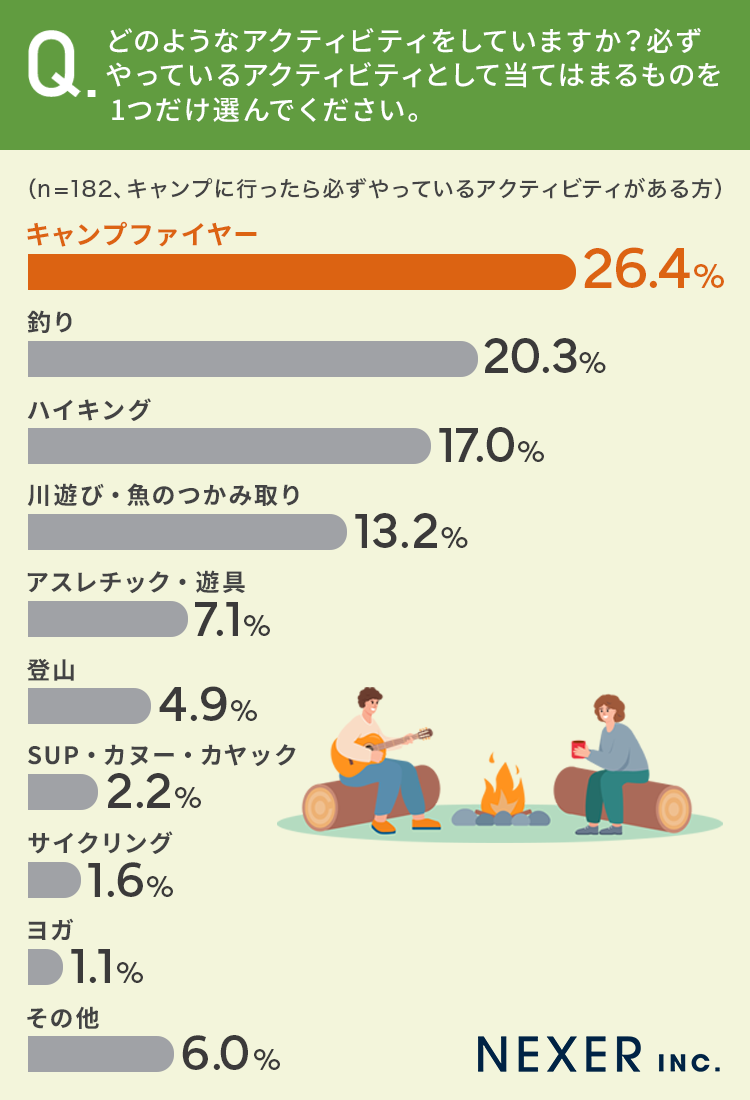 どのようなアクティビティを必ずしているのか調査したところ、「キャンプファイヤー」が26.4%で最多となり、