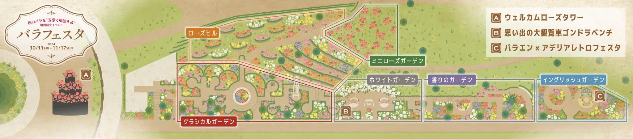 全長130mに渡り色彩豊かに美しく咲き誇るバラエンのバラとともに、園内全域でバラを五感で堪能することができるバラフェスタを、どうぞお楽しみください!