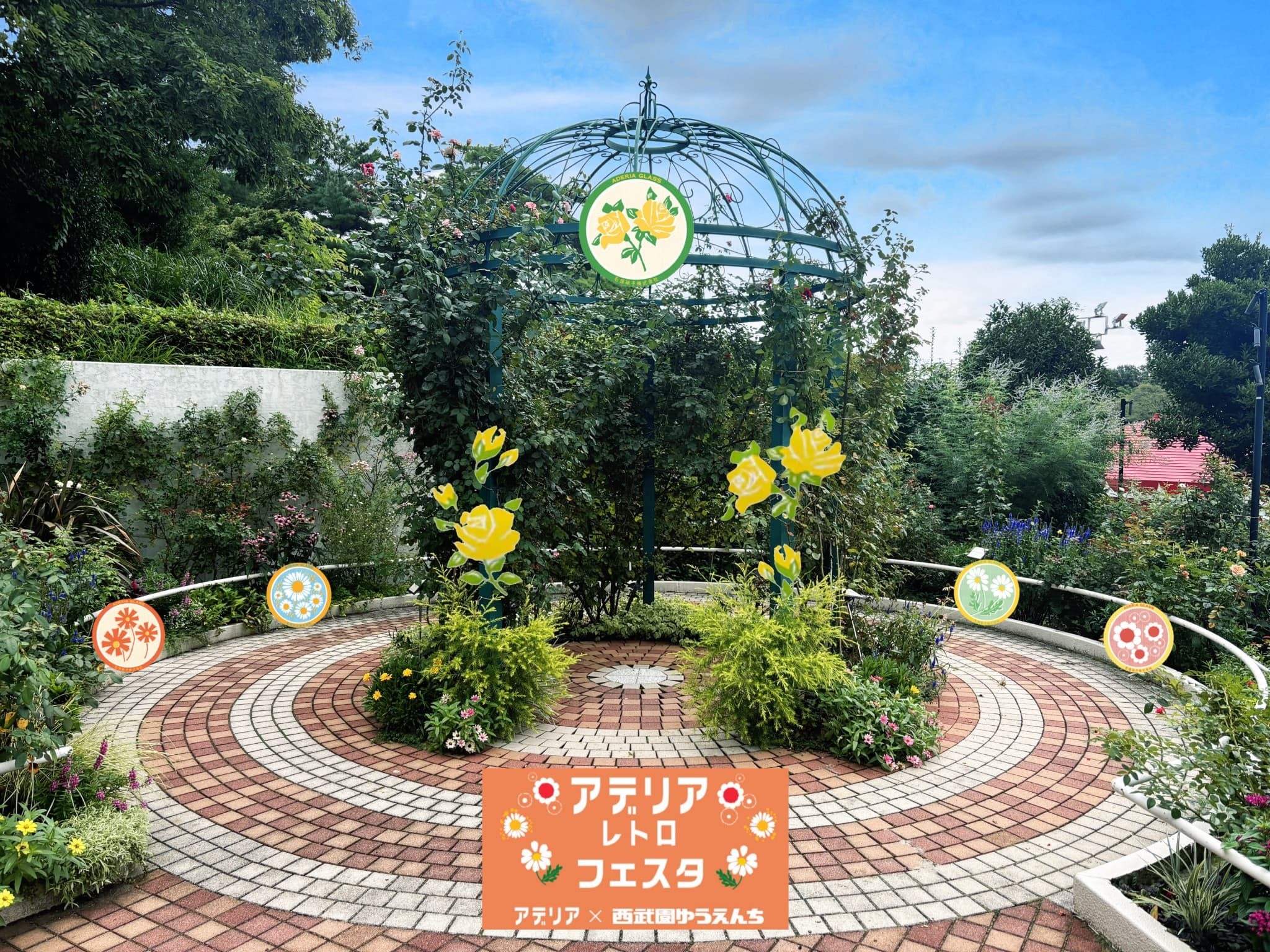 華やかなバラの柄“マスカレード”や昭和アデリアの代表柄である“アリス”などの花柄を使用したフォトスポットが、ガゼボに誕生!バラと宿根草に囲まれたガゼボが、アデリアの花たちとの共演により、かわいくて思わず心が躍るアデリアレトロの世界へと生まれ変わります。