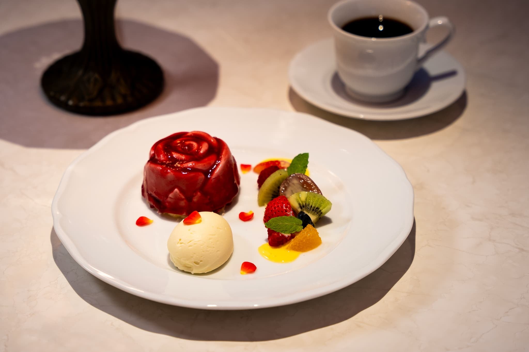 深紅のフランボワーズソースをまとった、バラ型のチーズムースが華やかなデザートプレートは、ほのかにバラの優しい香りが漂います。食堂車レストラン 黄昏号は、1960年代の豪華列車・食堂車の設えとなっており、ゆったりとした時間をお過ごしいただけます。