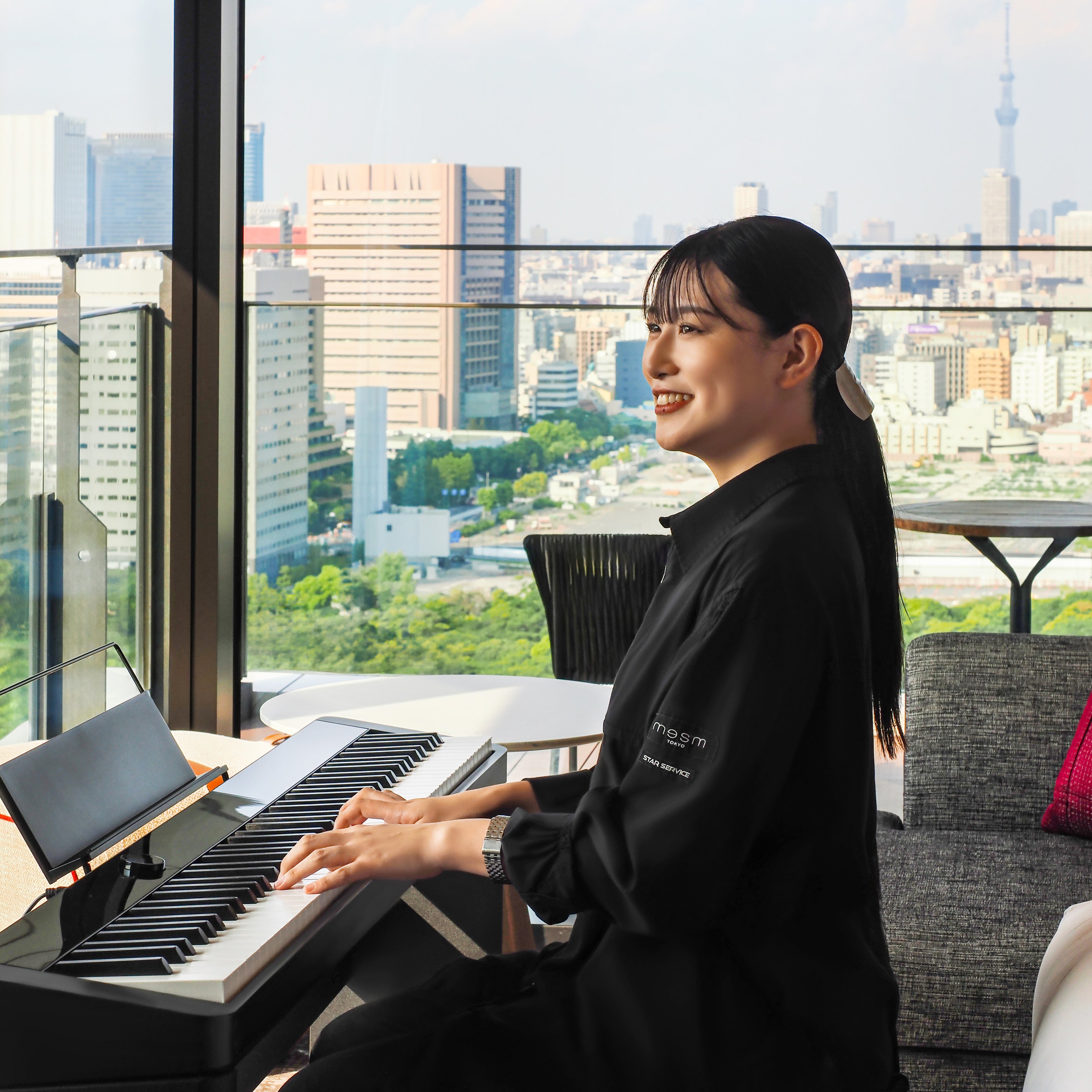 メズム東京では、全客室に設置した、カシオ計算機株式会社(以下カシオ)のデジタルピアノPrivia(プリヴィア)を通じた体験を「The Mark」としてお届けしています。ご到着時には、スターサービスタレント(ホテルスタッフ)が客室までご案内し、デジタルピアノでホテルのオリジナルメロディー「メズムジングル」を演奏しながら、お客様をメズムの世界へと誘います。また、ご滞在中は、お客様ご自身での演奏や、Bluetooth®スピーカーにてお好きな音楽の自動演奏をお楽しみいただけます。浜離宮恩賜庭園や東京のウォーターフロントを一望できる客室からの眺望とともに、メズム東京ならではの五感を魅了するユニークなホテルライフを満喫していただけます。