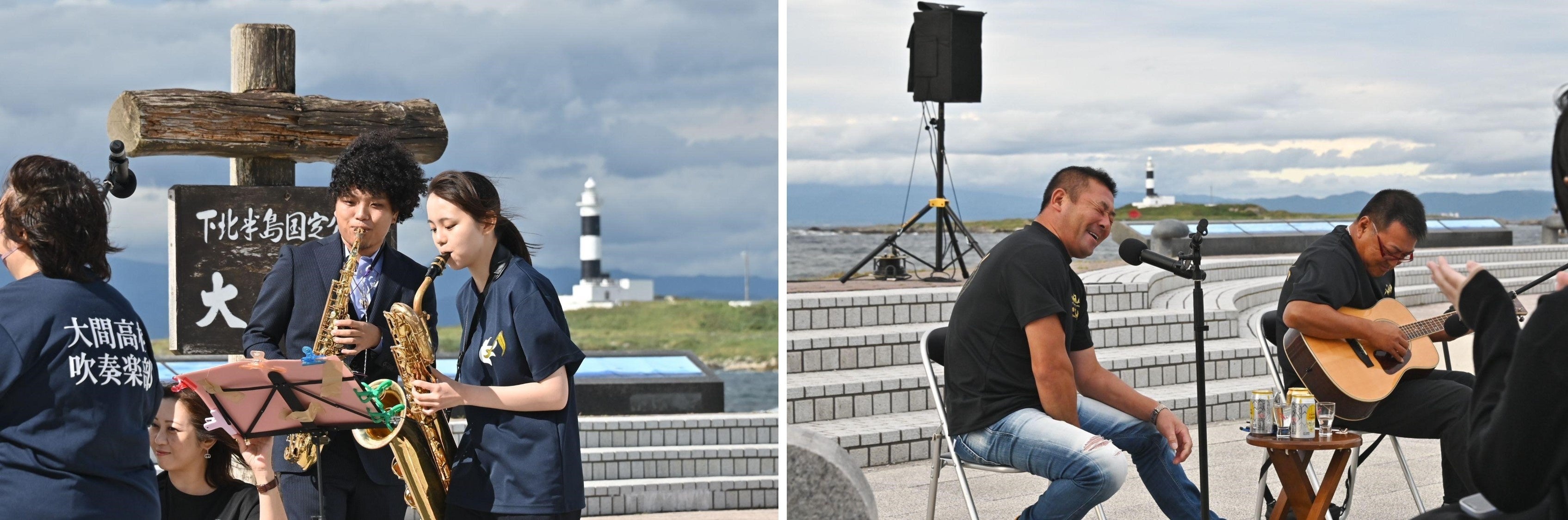 また、津軽海峡の青に映える美しいしろくろ灯台を背景に、地元の郷土芸能保存会による流し踊りや大間高校吹奏楽部による演奏、人気マグロ漁師によるアコースティックライブを楽しんでいただける秋の良き日になりました。暮れゆく大間崎の風景の中、サックスの音色に酔いしれながら大間埼灯台の点灯をみんなで愛でて、フィナーレを迎えました。