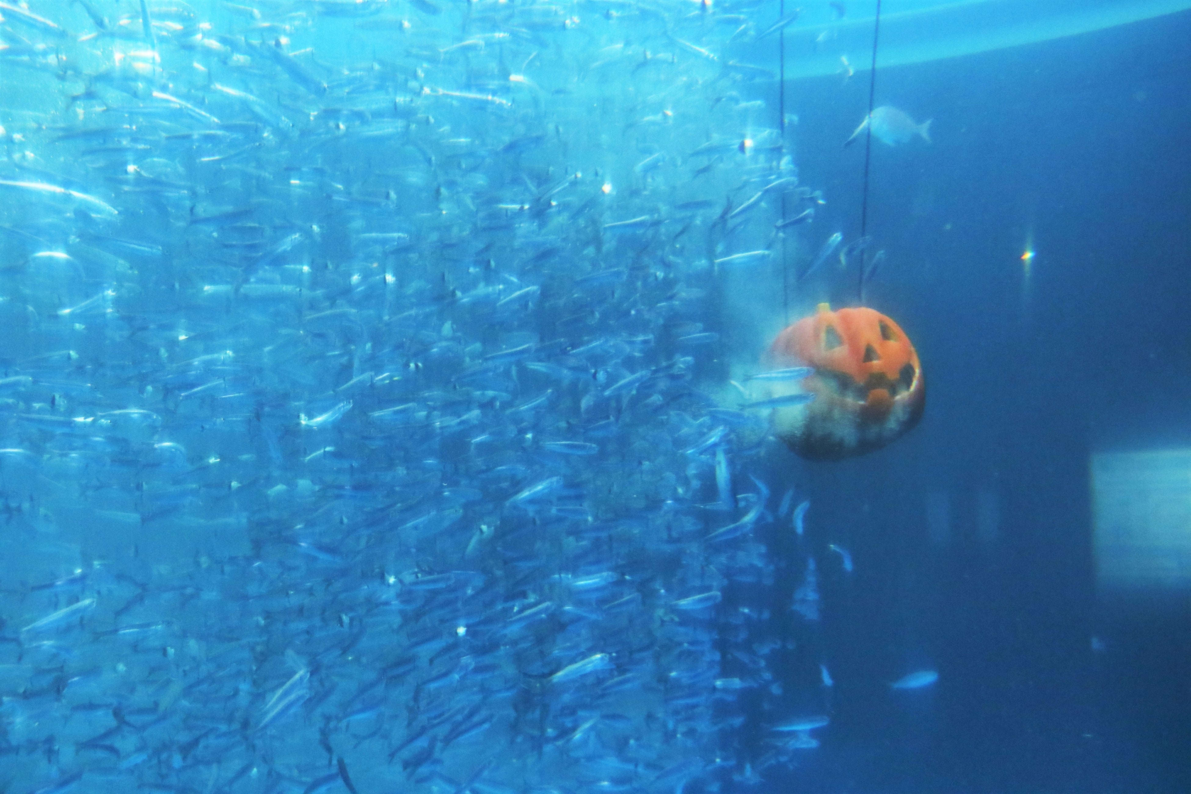幻想的なイルカの水族館「ドルフィン ファンタジー」では、ジャック・オ・ランタンの容器に入ったエサをイワシなどのお魚たちへプレゼントいたします。普段は群れをなしてゆったりと泳いでいるお魚たちがプレゼントをもらうシーンやエサを食べる様子を間近でご覧いただきながら、飼育員による生態解説を交えてご堪能いただけます。