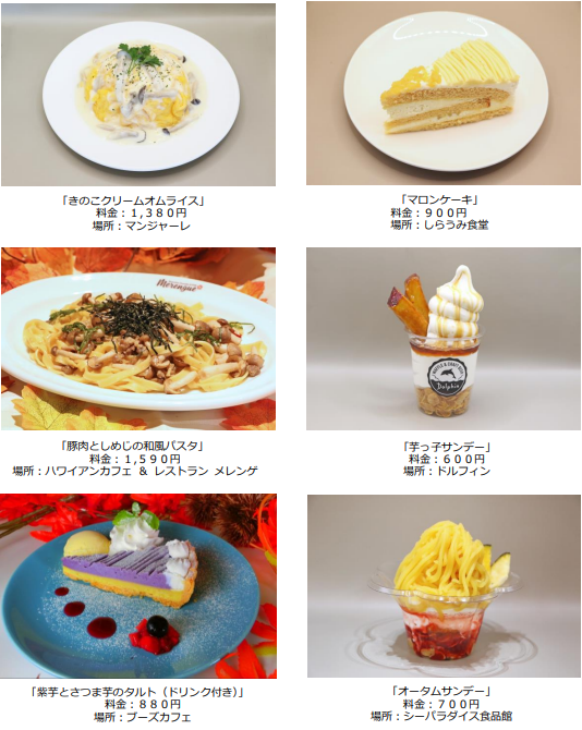 島内のレストランや軽飲食店舗では、食欲の秋にぴったりなメニューをご用意いたします。秋の味覚のひとつである、きのこをたっぷりと使用した「きのこクリームオムライス」や、上品な甘さを味わえる「マロンケーキ」など、メインのお食事からスイーツまで取り揃えます。