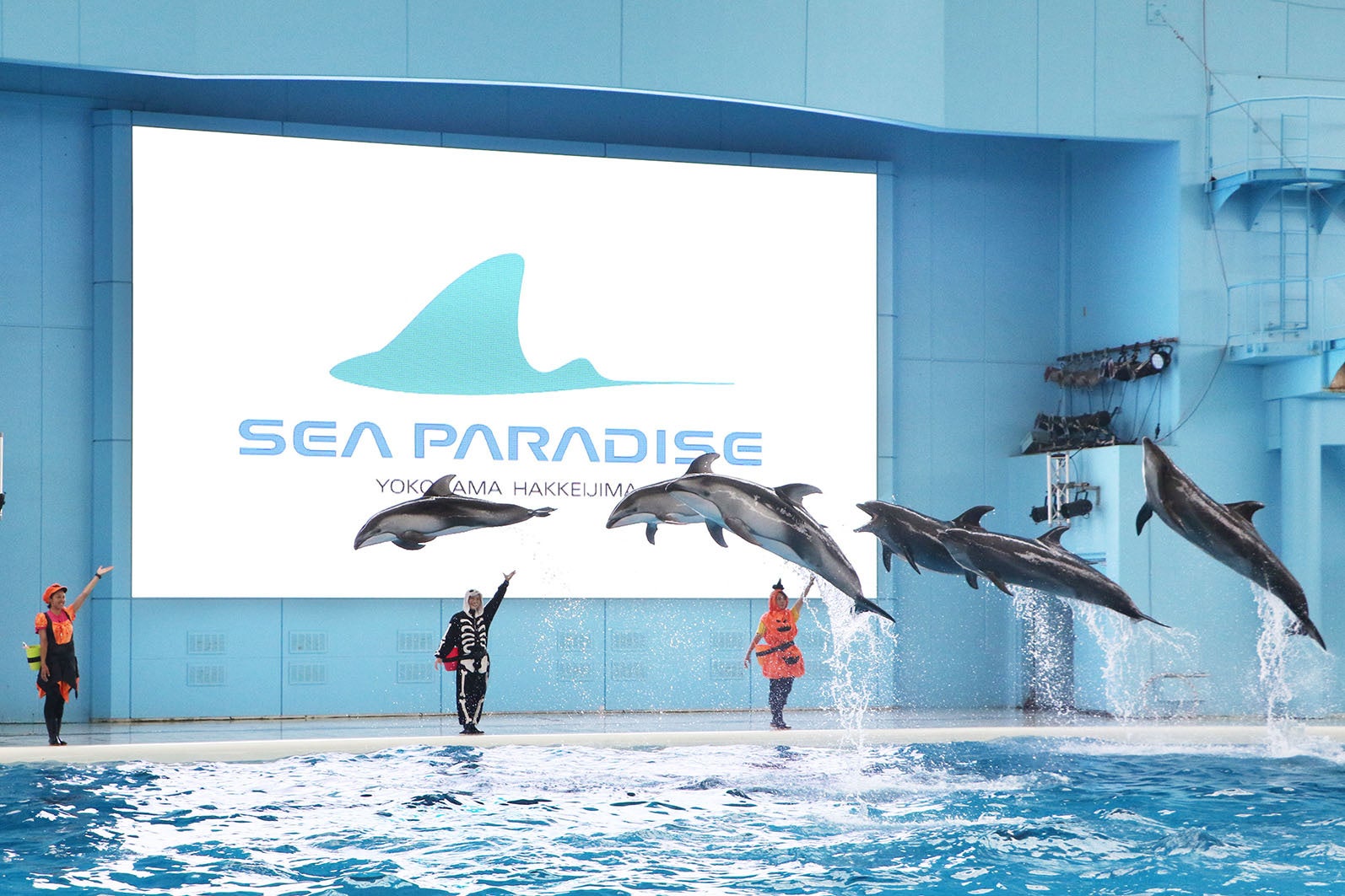セイウチによるコミカルなパフォーマンスをはじめ、シロイルカとトレーナーによる優雅な水中パフォーマンス、バンドウイルカやカマイルカによるダイナミックなジャンプなどを披露し、ハロウィンパーティを盛りあげます。