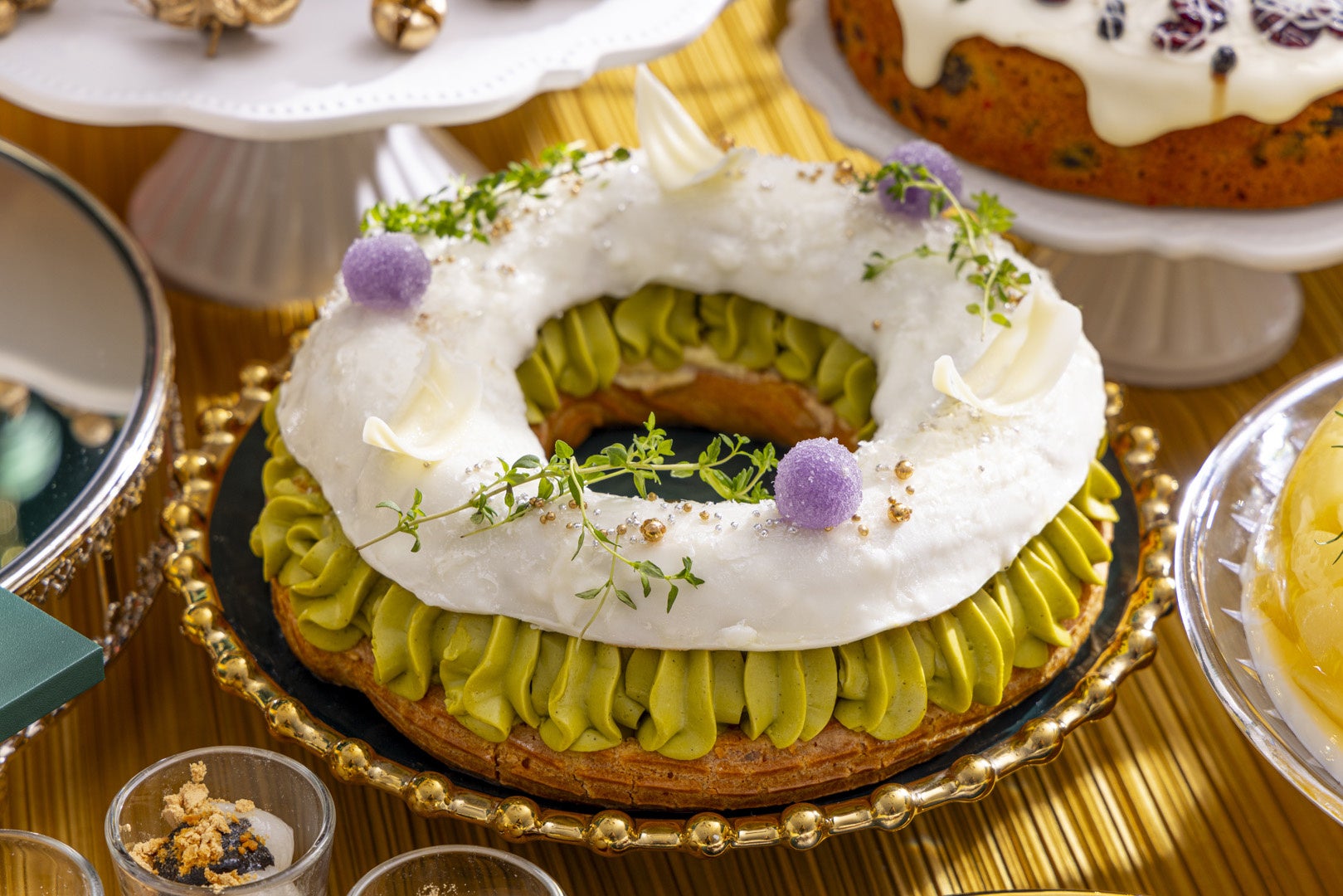 リング状のシュー生地にピスタチオ風味のクリームをたっぷり挟んだリッチな味わいのケーキを、クリスマスリース風に仕立てました。