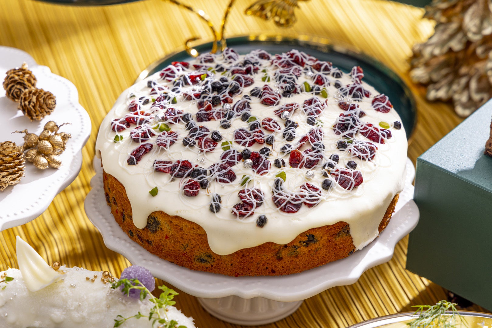 洋酒漬けクランベリーやミックスフルーツラムレーズンを入れたベイクドバターケーキ。雪降る森をイメージしてデコレーションしました。