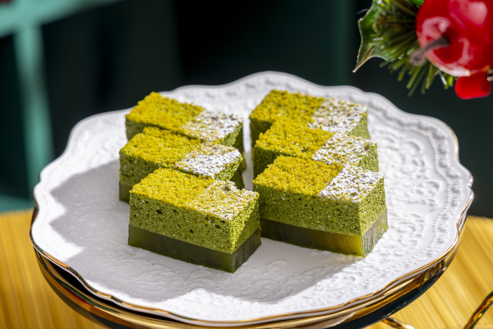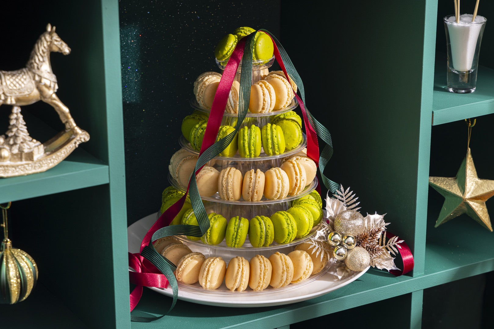 バニラとピスタチオ風味のマカロンをクリスマスツリーに見立ててデコレーション。