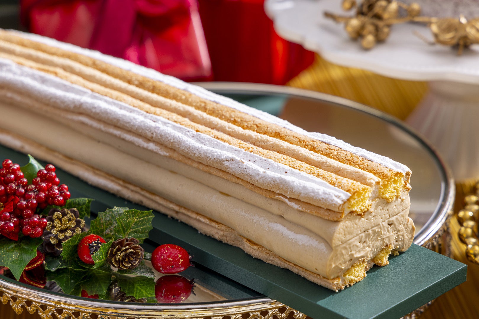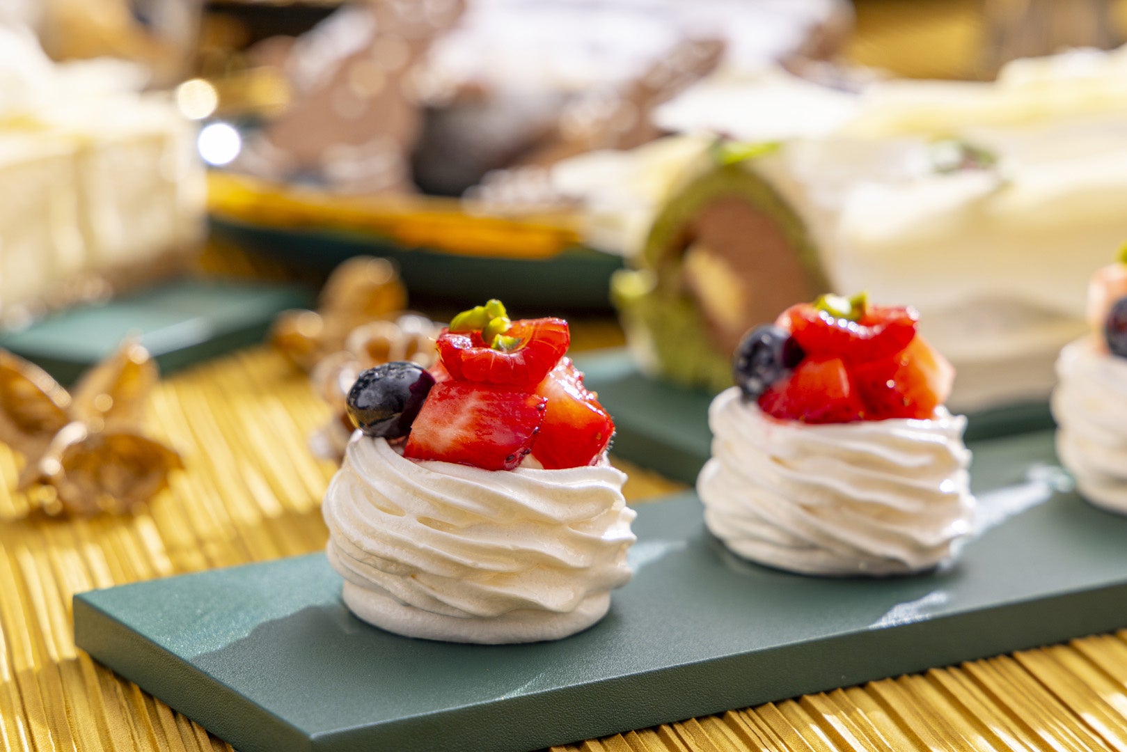 フランスの定番のクリスマスケーキに雪化粧をほどこしたようにデコレーションした「ホワイトブッシュドノエル」、リング状のシュー生地にピスタチオ風味のクリームをたっぷり挟み、クリスマスリースに見立てた「クリスマスパリブレスト」などクリスマス感を演出するスイーツのほか、チェリーとチョコレートを使用した、森をモチーフにしたドイツの伝統菓子「クリスマスブラックフォレスト」、白と黄の縞模様が可愛らしいオーストリアの首都ウィーンの伝統菓子「カーディナルシュニッテン」など、ヨーロッパ各地のお菓子をご用意しました。また、今注目のスイーツ「パブロバ」を甘酸っぱいベリーとカスタードクリームでデコレーションした「ベリーベリーパブロバ」もおすすめです。