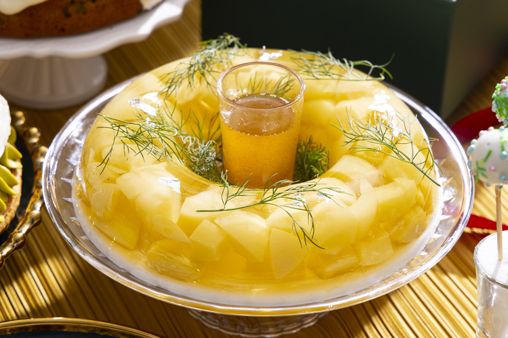 白桃のコンポートをノンアルコール白ワインゼリーの中に閉じ込めました。ジンジャーやカルダモン風味のシロップを添えて。