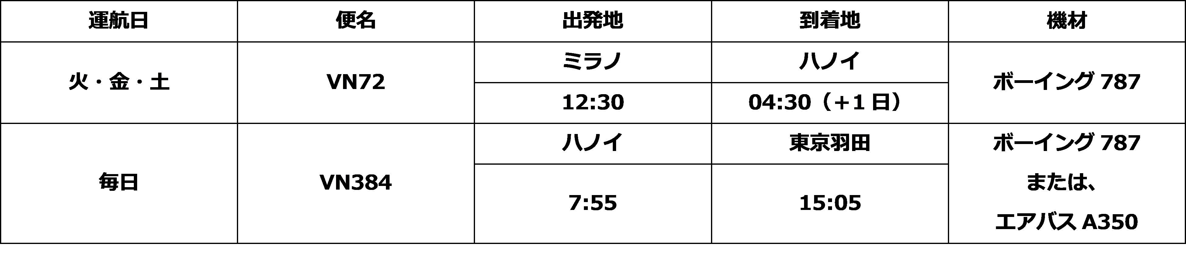 ベトナム航空は、ハノイ/ホーチミンとパリ/フランクフルト/ロンドンを結ぶ直行便を運航する唯一の航空会社であり、2024年10月4日よりドイツ第3の都市「ミュンヘン(MUC)」とハノイ/ホーチミンを結ぶ直行便の就航も決定しています。今回の「ハノイ=ミラノ線」の新規就航は、イタリアだけでなく、他のヨーロッパ諸国からの旅行者を魅了するほか、経済的、社会的、政治的な結びつきを促進します。東京羽田からは、ハノイを経由し、数時間の乗り継ぎでミラノ線に接続が可能で、日本を夕方出発、翌朝にミラノへ到着をするスケジュールとなります。さらに、2025年以降には「ホーチミン=ミラノ線」を導入する予定です。スケジュールや運賃は次項をご確認ください。
