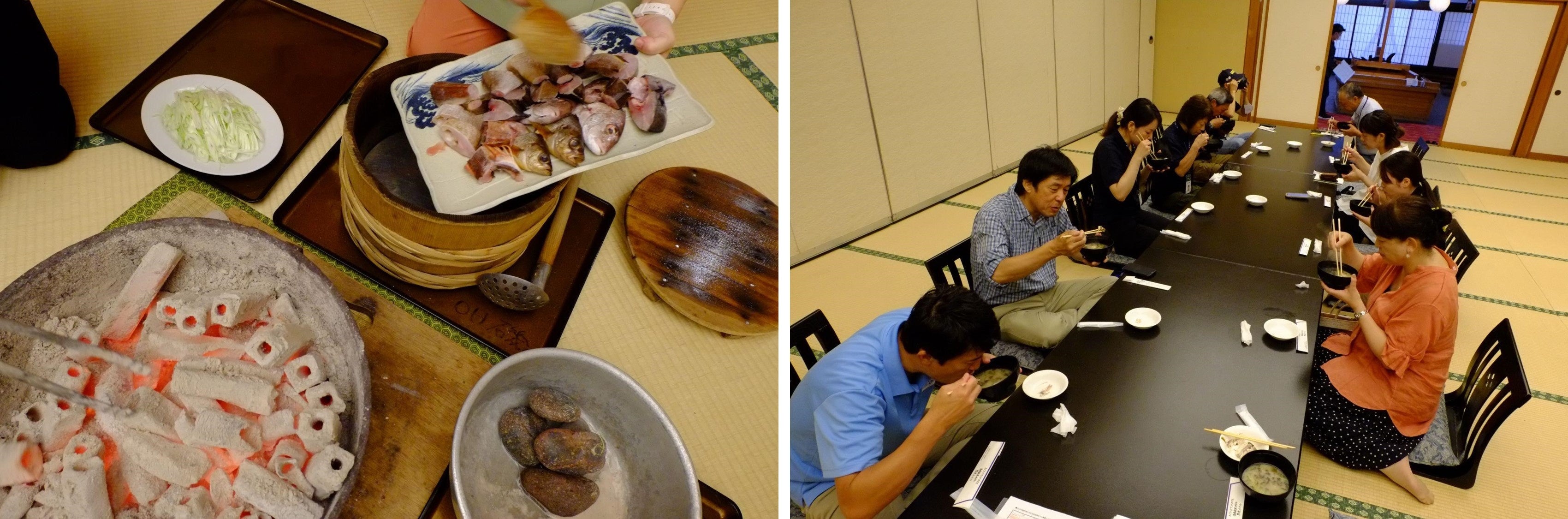 有識者検討会で、昔の人たちは浜辺で水の状態から作っていたとの意見があったため、今回は食べ比べの調査を行いました。事前に考えられることとしては、水から作った方は魚の生臭さが残るのでは無いか、長時間煮ることで魚が硬くなってしまうのではないかなどの意見が出ましたが、結果としては味に大きな違いはなく、どちらも美味しいとの感想があがりました。ただし、水から作った場合は熱した「溶結凝灰岩」の石の数がお湯から作った場合の3倍は必要なことと、完成するまでの時間も長くかかりました。熱した石の用意と料理を作る時間が長くかかることを考えると、お湯から作った方が現在の提供に適しているのではないかとの意見があがりました。