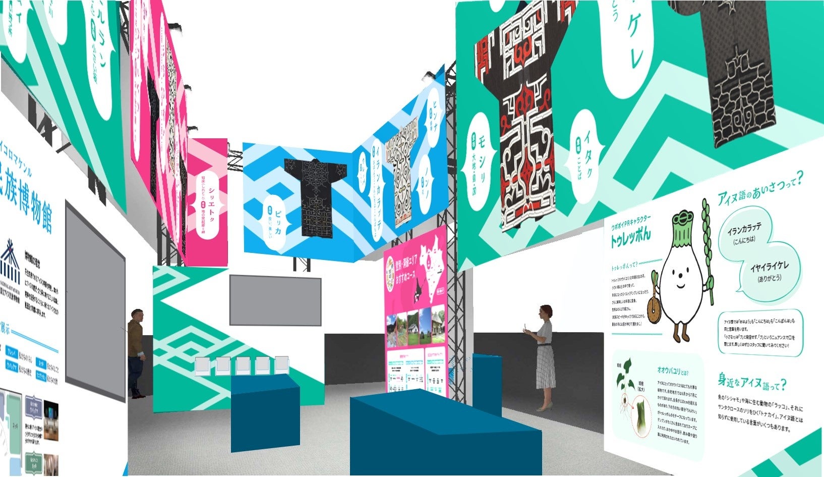 ブース内ではアイヌ民族の工芸品や民具の展示をはじめ、アイヌ衣裳試着体験やフォトスポットもあり、アイヌ文化に触れていただくことができます。