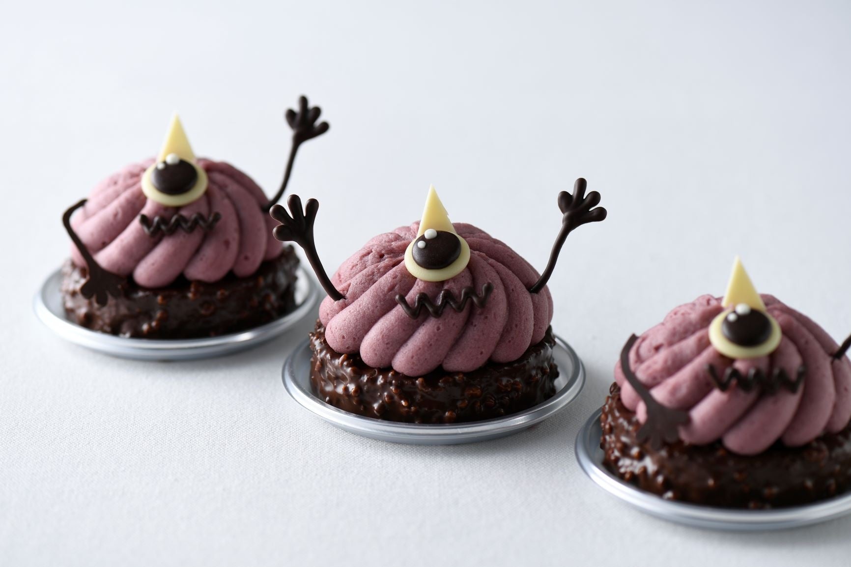 ハロウィンシーズンにぴったりの、一つ目おばけのモンブランです。さっぱりとした甘みの紫芋クリームにマロンクリームとバターを合わせ、風味豊かに仕上げました。中には甘酸っぱいカシスジャムやなめらかな生クリーム、土台にはビターテイストのガトーショコラを合わせることで、全体の調和を取りつつ飽きの来ない味わいに。