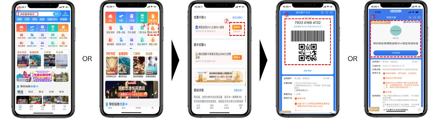 ①グローバルオンラインショッピングサービスのトップページの検索機能から目的地や商業施設を検索し、クーポンを取得