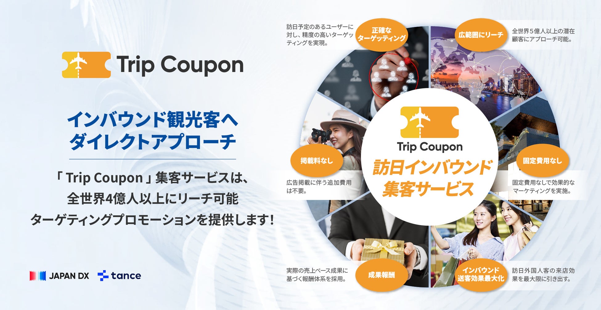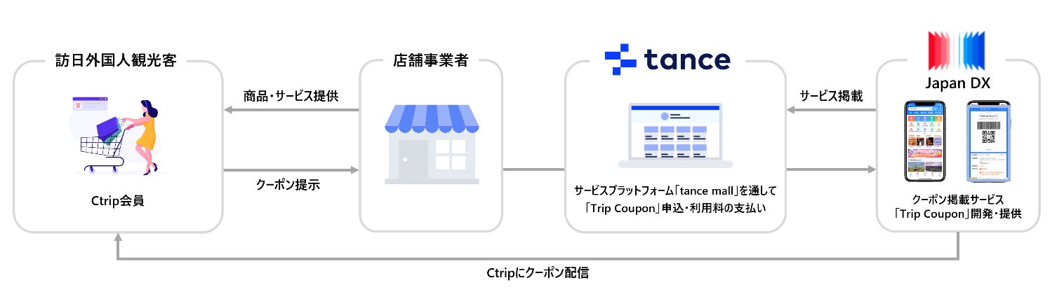 tance株式会社(本社:東京都新宿区、代表取締役社長:中井 和寛、以下tance)とJapan DX株式会社(本社:東京都港区、代表取締役:陳清揚、以下 Japan DX)は、2024年9月5日(木)より、店舗向けのサービスプラットフォーム「tance mall(タンスモール)」において、Ctripユーザー向けのクーポン掲載サービス「Trip Coupon(トリップクーポン)」の提供を開始しました。なお、本サービスの「tance mall」への営業推進は、JCBグループ*をはじめとした営業パートナーが担います。