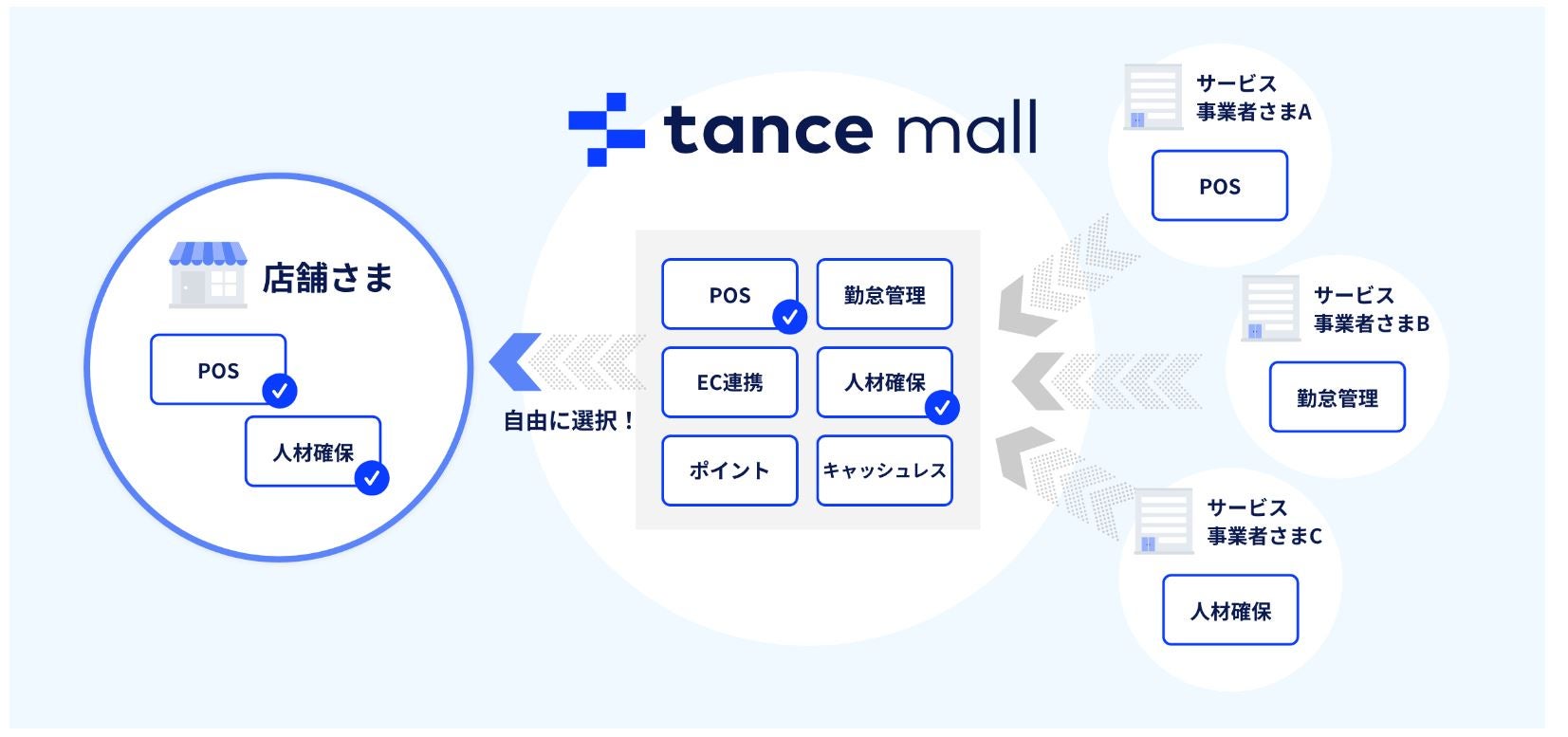 店舗運営に役立つサービスを、決済端末から汎用タブレットにいたるまで利用シーンに応じたデバイスで使えるサービスプラットフォームです。店舗事業者は「tance mall」上にあるサービスの中から必要なサービスを選択・申し込み、使いたい端末で利用できる仕組みで、集客力向上や業務効率化、DXの推進など、店舗の抱える様々な課題を解決します。
