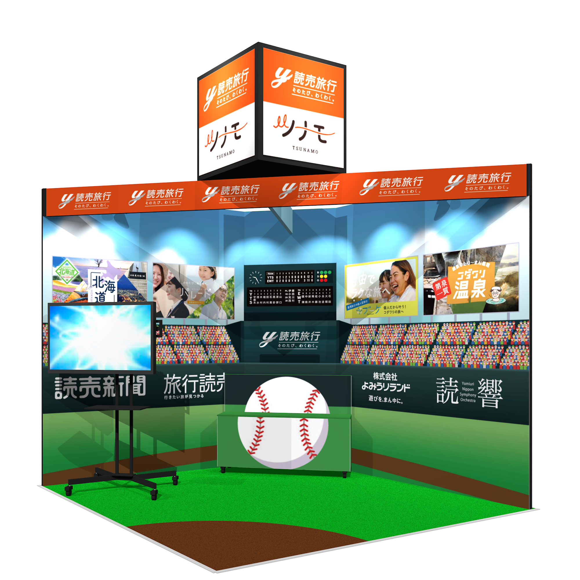読売旅行の今年のテーマは、「集まれ! EXPOスタジアム~つなげるYOMIURI打線~」です。野球のスタジアムをイメージしたブースで、読売新聞グループ各社のつながりを通した当社の様々な取り組みや、今年オープンした読売旅行が運営するオンラインモール「ツナモ」を紹介します。