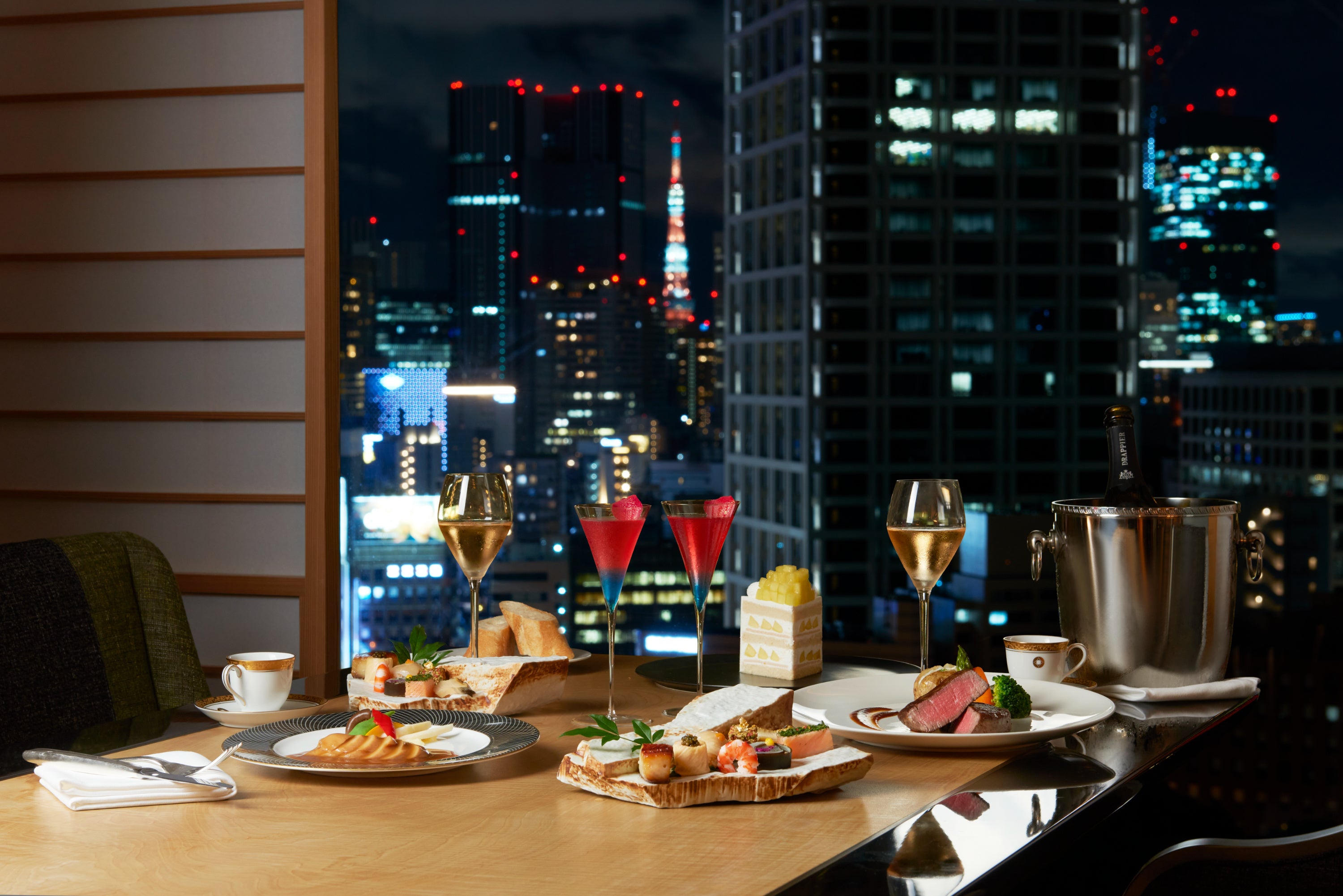 本プランの主役は何と言っても、プラン限定のインルームディナーコース。特別ディナーコースの幕開けを飾るのは、メインバー「バー カプリ」のエグゼクティブチーフバーテンダー 小森谷 弘が考案した、60周年記念カクテル「New Stage あらたな幕開け」。“ホテルの歩みに合わせて、お客さまと共に輝き続けたい”という思いを込めたセレブレーションカクテルです。