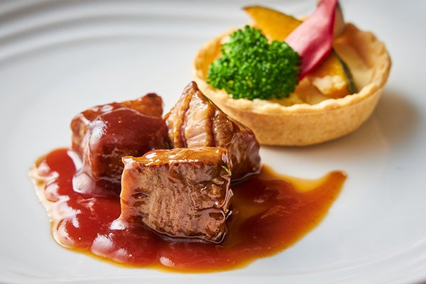 素材がもつ旨味をいかした炙り・炭火&鉄板焼き料理の四季彩茶寮「旬香」より、見た目も華やかなクリスマスディナー「旬香聖和」をお贈りします。「フォアグラ茶碗蒸し」や「サーモンチーズ巻きキャビア添え」など豪華な前菜盛り合わせをはじめ、厳選した 5 種類の素材(国産牛・銘柄豚・銘柄鶏・旬魚・魚介類)から2種類お選びいただけるメインディッシュなど、日本料理の技巧を用いながら洋風に仕上げたクリスマス期間限定のコース料理をお楽しみいただけます。ホテルパティシエ特製デザート「ピスタチオムース チョコレート包みとフランボワーズシャーベット クリスマス仕立て」は特別な夜の食事を締めくくるのにピッタリな一品です。