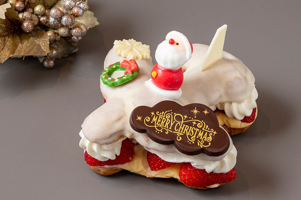 羽田エクセルホテル東急定番のお菓子となった飛行機シュー。通常販売より一回り大きいサイズでのご提供です。飛行機型のシュー生地にカスタードクリーム、生クリーム、苺をサンドし、クリスマス仕様に飾り付けました。今年は昨年より苺を多く使用し、ボリュームアップしました。