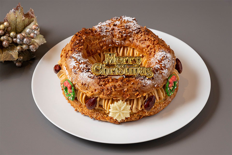 リング状のシュー生地にクリームをサンドしたフランスのクラシカルなお菓子「パリブレスト」にオーナメントをあしらい、クリスマスの装いに仕上げました。香ばしく焼き上げたシューに、プラリネクリームと、カスタードクリームにバターを加えたムースリーヌの2種類のクリームを挟んでいます。キャラメリゼしたアーモンドのカリッとした食感がアクセントです。
