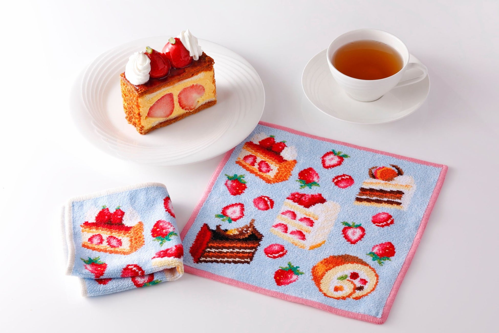 ジェール』など、⼈気のラインアップをかわいく織り込んだ1枚に仕上げました。ハンカチの縁どりカラーは全3⾊で、いちごにぴったりの「ピンク」、なじみの良い「アイボリー」、差し⾊となる「ターコイズブルー」がラインアップ。