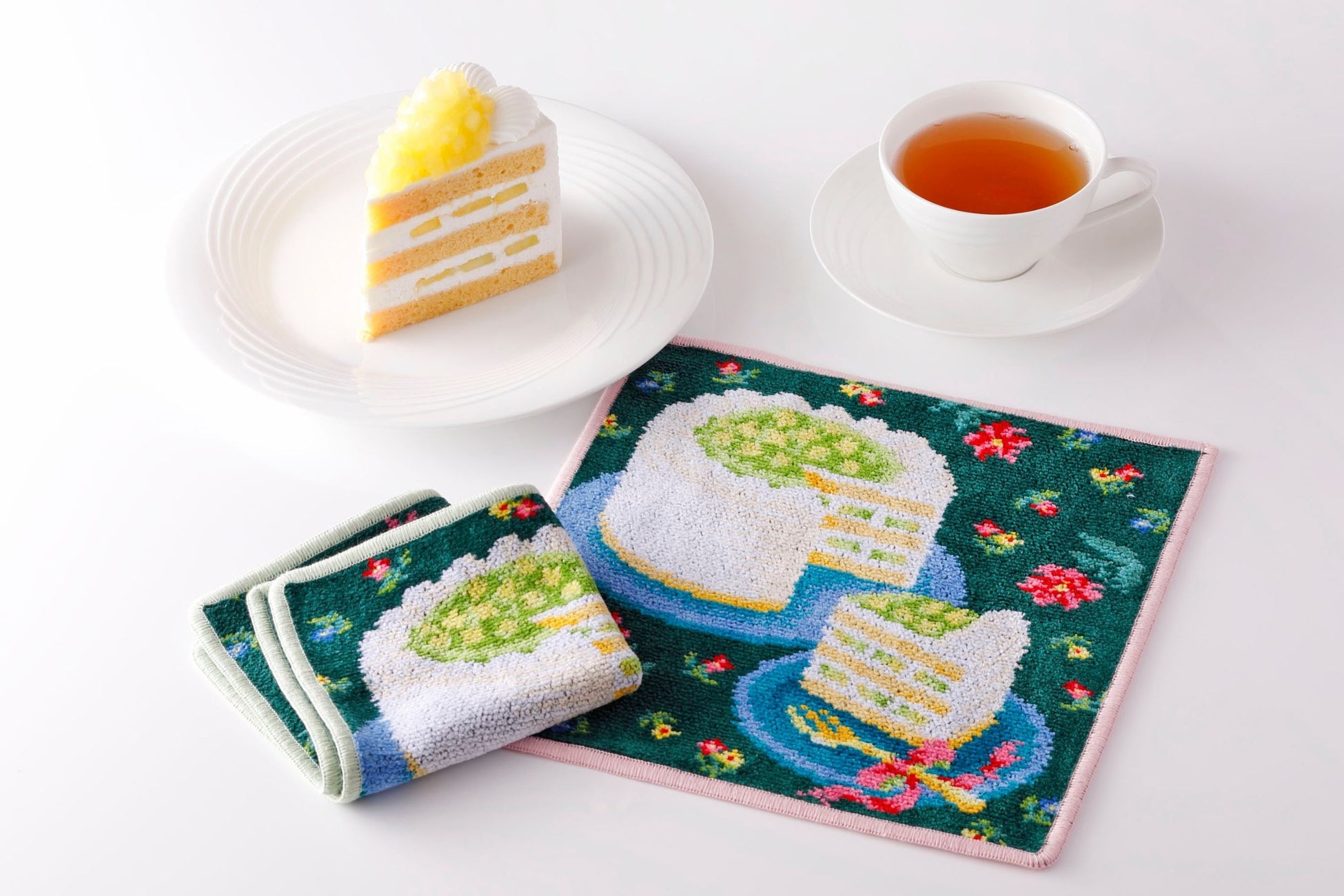 シリーズ」より『スーパーメロンショートケーキ』をハンカチいっぱいに織り込んだデザイン。フェイラーの⼈気デザイン『ハイジフラワー』をホテルニューオータニオリジナルのロイヤルグリーンで表現。気品⾼い1枚に仕上げました。