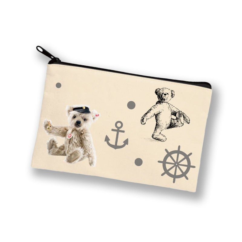 お気に入りのテディベアアイテムを選んだりマリンスタンプをおしたりしてポーチをつくろう